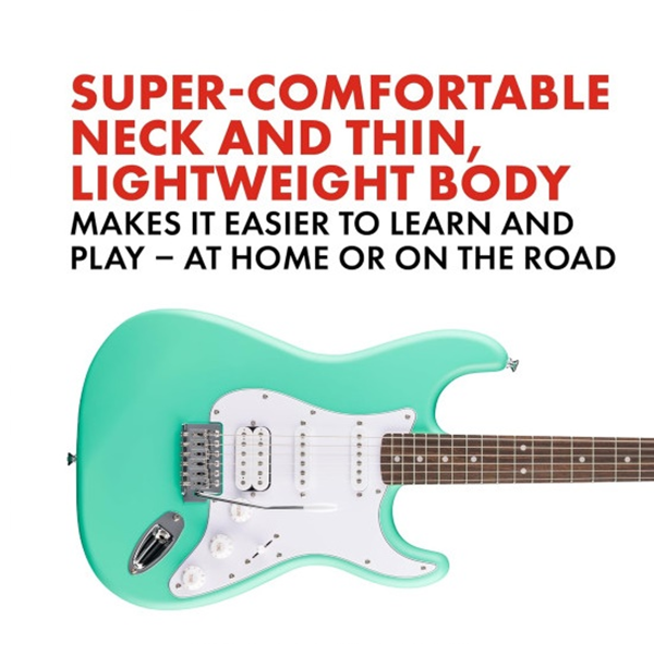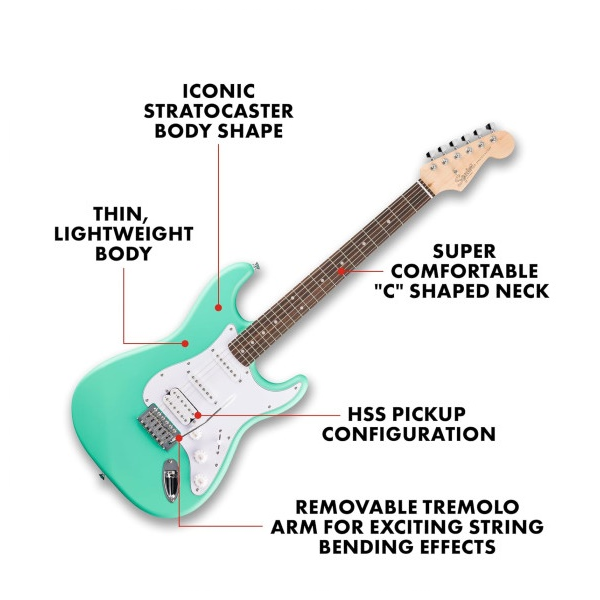 Squier Debut HSS električna gitara strat oblika sa tremolom je jednostavna, pristupačna i praktična gitara dizajnirana za početnike i napredne svirače. Klasičan stil nadopunjuje dodatni humbucking pickup u HSS konfiguraciji. Ostale karakteristike uključuju petopolni prekidač, sinhronizovani tremolo, lako svirljiv vrat sa 22 praga.